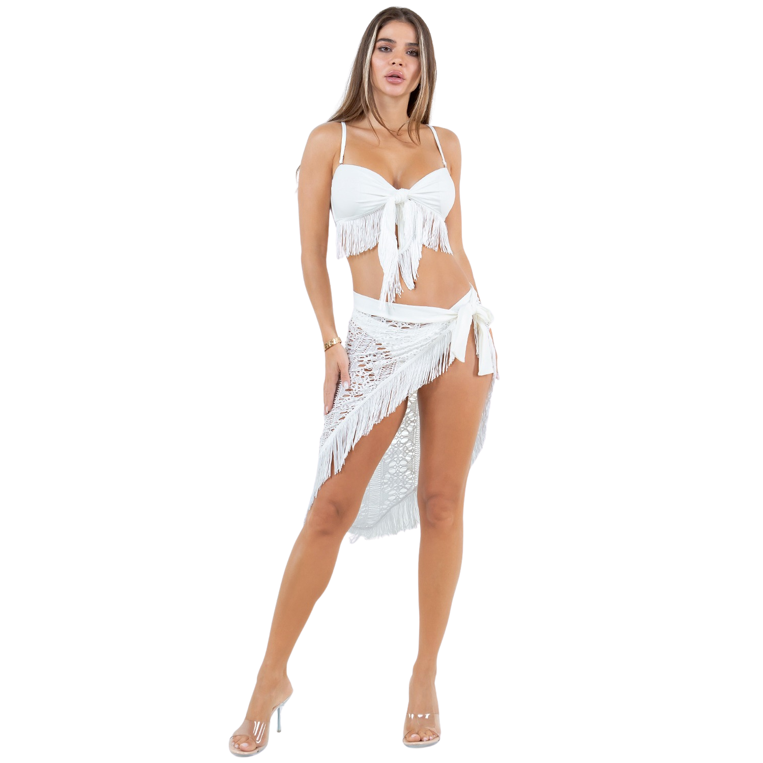 Conjunto de dos piezas: top con flecos + Bikini+ pareo de encaje negro.