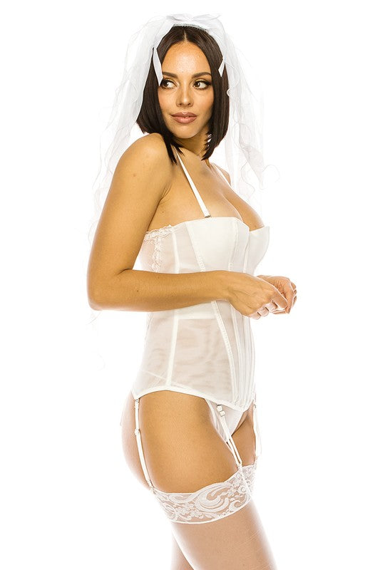 Corset de Lencería Sexy Blanco con Transparencia, Tanga y Liguero